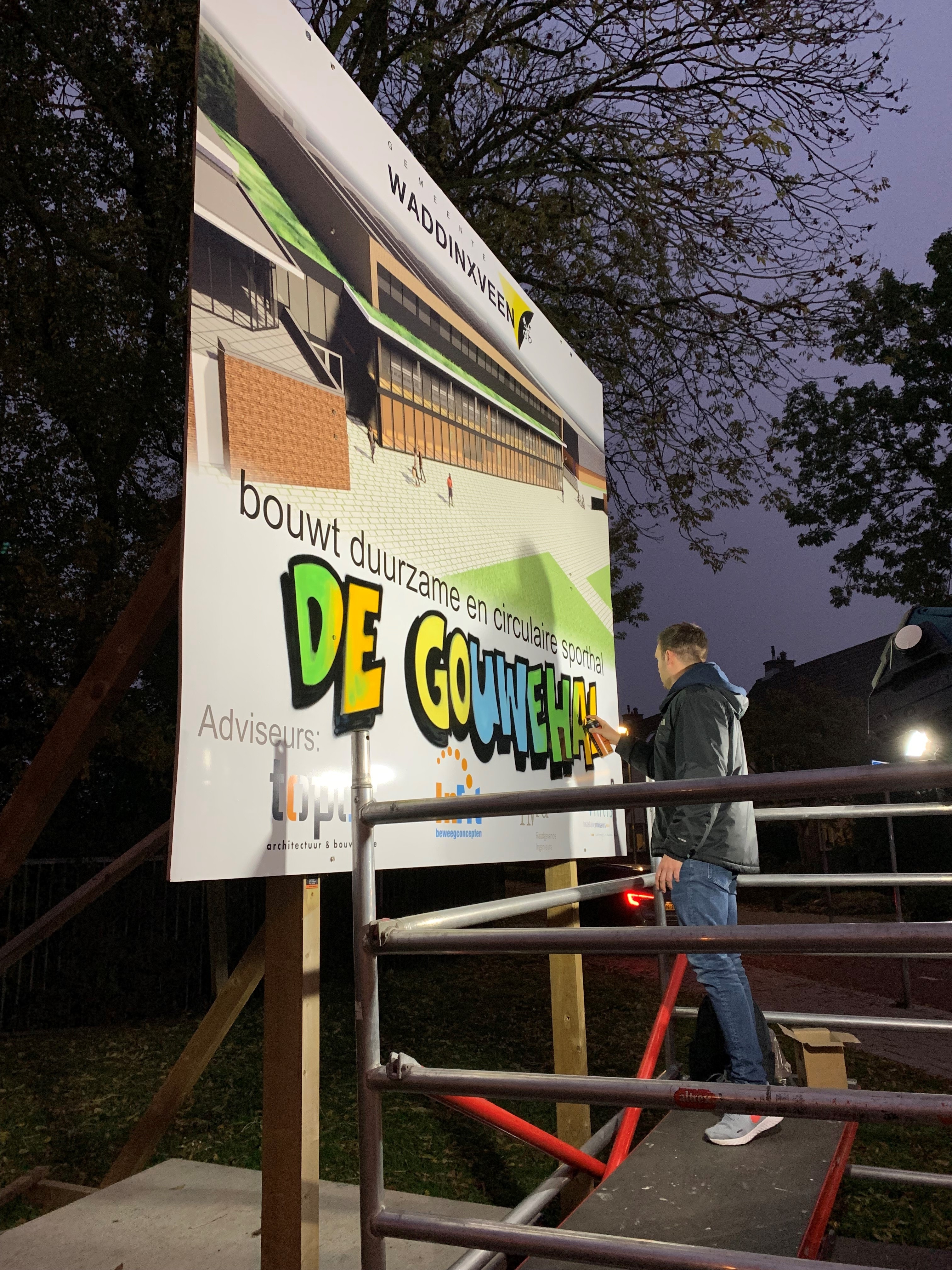 De nieuwe sporthal krijgt de naam: De Gouwehal! Op 11 november werd de naam van de nieuwe sporthal op sportpark De Sniep onthuld. De wethouders Brigitte Leferink (Sport) en Kirsten Schippers (Maatschappelijk Vastgoed) overhandigden de spuitbussen aan Ruud Kooger. Waarmee de grafisch kunstenaar de naam ‘De Gouwehal’ op het bouwbord aanbracht. Iedereen kon in oktober namen doorgeven voor de nieuwe sporthal via Waddsup. Lenneke Olie en Gert-Frank van der Poel bedachten beiden de naam De Gouwehal. Zij krijgen een OPW-bon van 50 euro. De winnaars van de OPW-bonnen van 20 euro zijn Henk Beekhuizen en Alwin Jansen. Zij stemden op de winnende naam De Gouwehal.